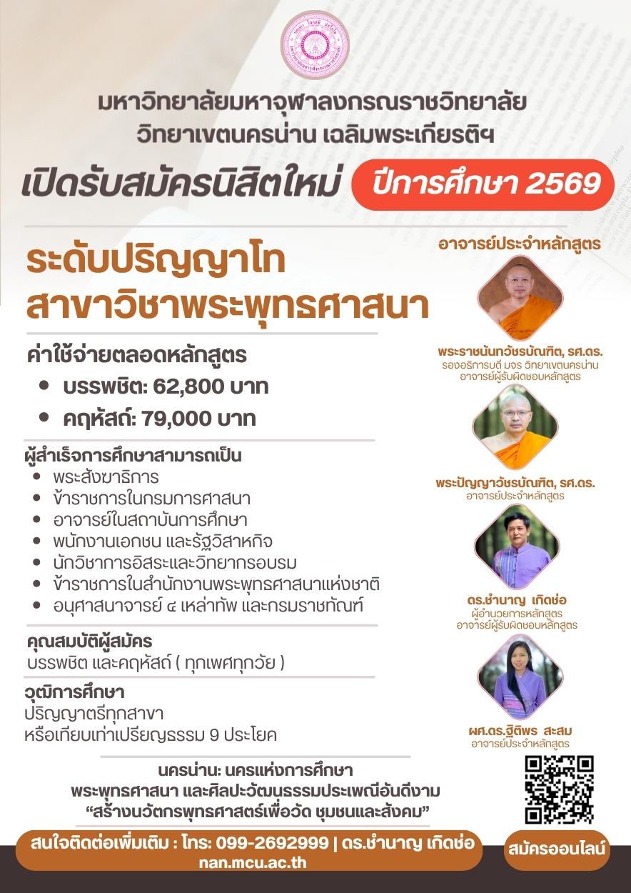 สมัครเข้าศึกษาต่อระดับปริญญาเอก พุทธศาสตรดุษฎีบัณฑิต ประจำปีการศึกษา ๒๕๖๙ (ออนไลน์)