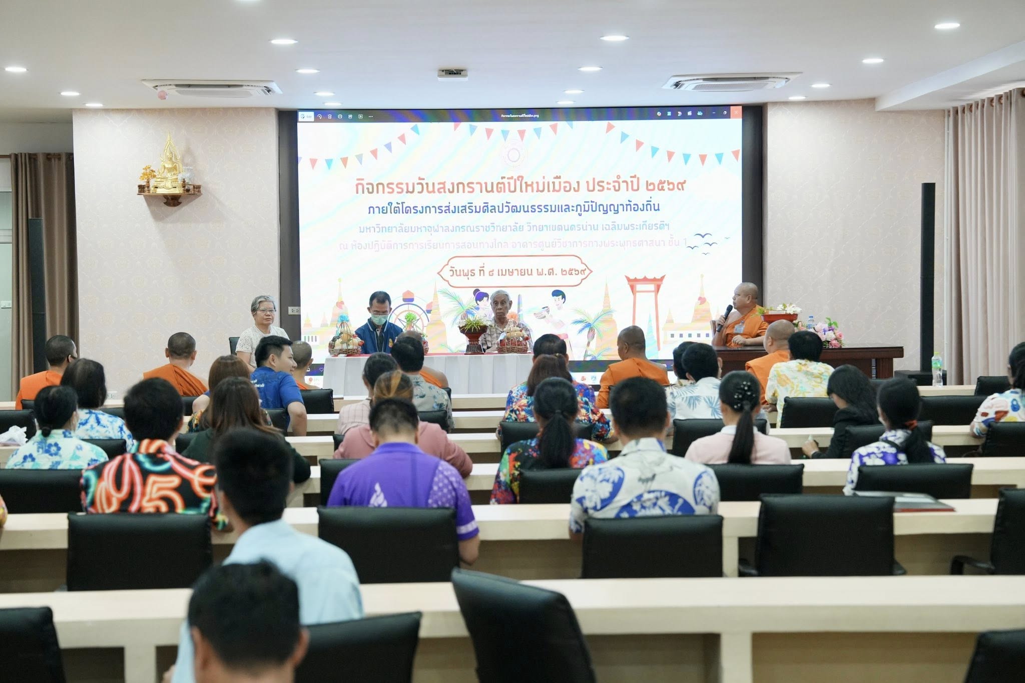 วันพุธ ที่ 8 เมษายน พ.ศ.2569 เวลา 09.00 น. มจร วิทยาเขตนครน่าน เฉลิมพระเกียรติฯ ได้จัดกิจกรรมวันสงกรานต์ปีใหม่เมือง ประจำปี 2569 ภายใต้โครงการโครงการบุคลากรและนิสิตหัวใจรักษาศิลปวัฒนธรรมและภูมิปัญญาท้องถิ่น โดย พระราชนันทวัชรบัณฑิต, รศ.ดร. รองอธิการบดี มจร วิทยาเขตนครน่าน เฉลิมพระเกียรติฯ คณะผู้บริหาร คณาจารย์ เจ้าหน้าที่ ร่วมกับโรงเรียนพระปริยัติธรรมวัดพระธาตุแช่แห้ง โดยร่วมกันสระเกล้าดำหัวผู้บริหาร คณาจารย์ เนื่องในเทศกาลมหาสงกรานต์ปีใหม่เมือง ตามฮีตฮอยประเพณีล้านนา ณ ห้อง 101 อาคารเฉลิมพระเกียรติ ชั้น 1 ณ ห้องปฏิบัติการการเรียนการสอนทางไกล อาคารศูนย์วิชาการทางพระพุทธศาสนา ชั้น 1 ตำบลฝายแก้ว อำเภอภูเพียง จังหวัดน่าน